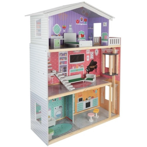 Tento prostorný domeček pro panenky v jemných, nevtíravých barvách podporuje představivost a role-play. Otevřená konstrukce zpřístupňuje všechny místnosti, takže si děti snadno zahrají v obýváku, kuchyni, ložnici i koupelně – a nechybí ani balkon.