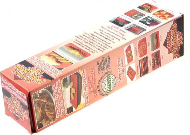 Univerzální silikonová podložka s pyramidovou strukturou pro zdravější a rovnoměrné pečení masa, ryb, pizzy i dezertů. Díky zvýšeným výstupkům zajišťuje cirkulaci horkého vzduchu, odvod přebytečného tuku a má nepřilnavý povrch pro snadné čistění. Podložka je zdravotně nezávadná, odolná vůči teplu a ohebná pro úsporné skladování.