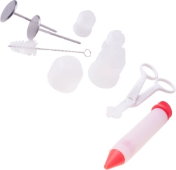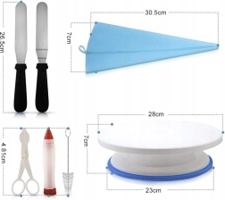 - Otočný podnos 28 cm, 48 nerezových trysek (číslované 1–48), 6 velkých trysek (1–6), 2 malé spojky, 1 velká spojka, 2 silikonové sáčky, 2 špachtle, dekorovací pero, 2 jehly/napichovátka na dekorace, 12 silikonových košíčků na muffiny, drátový kráječ na korpus, 3 znovupoužitelné sáčky na krém, 10 jednorázových cukrářských sáčků, kartáček na čištění trysek, kleštičky