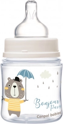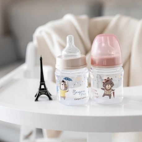 Praktická kojenecká lahev Canpol babies EasyStart z kolekce BONJOUR PARIS o objemu 120 ml s antikolikovou savičkou 0m+ a širokým hrdlem pro snadné plnění a mytí. Nabízí nový antikolikový ventil pro pohodové bříško, přesnou stupnici pro kontrolu množství a je BPA free.