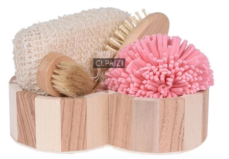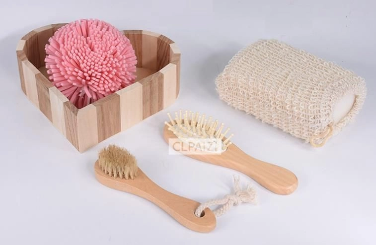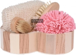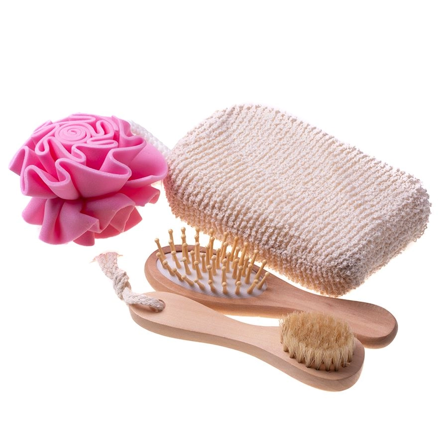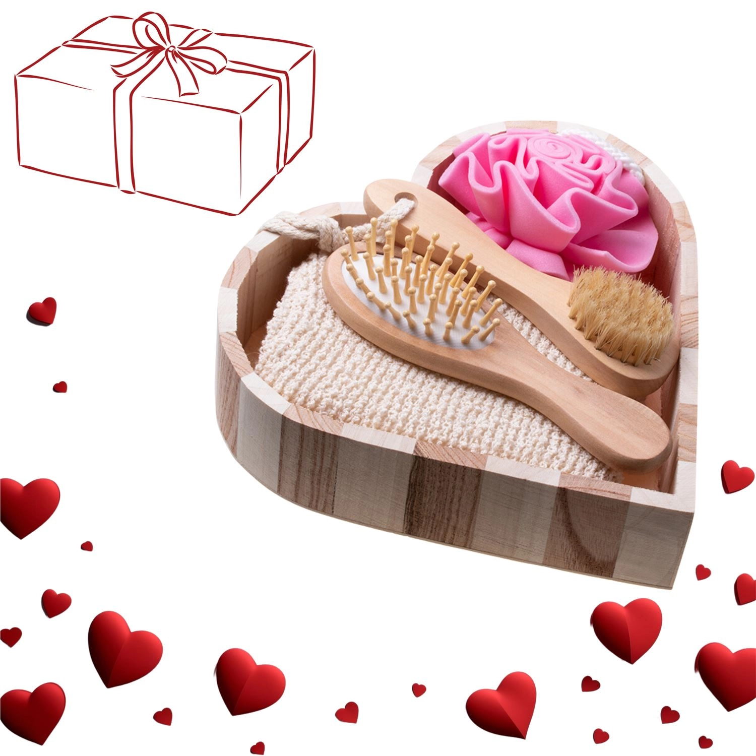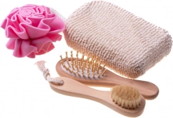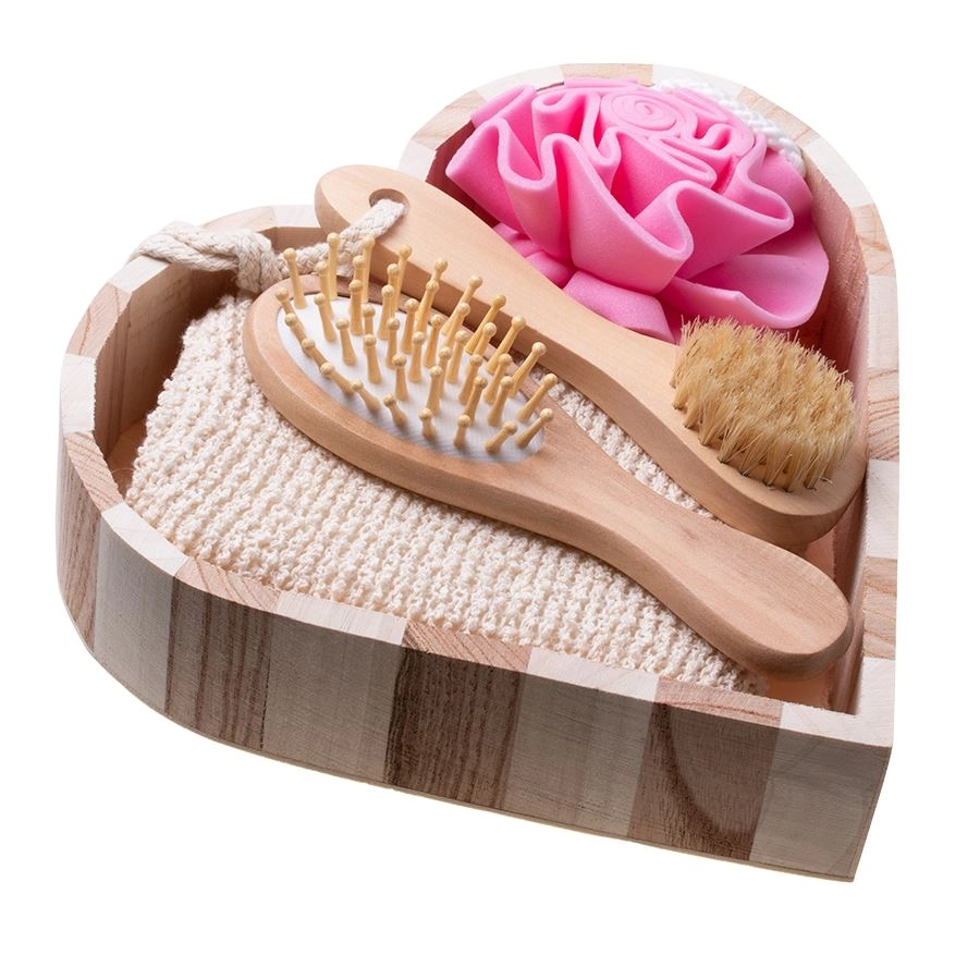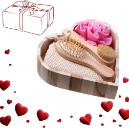 Tato 4dílná spa sada je uložena v elegantním dřevěném košíku ve tvaru srdce (cca 5,5 × 20 × 20 cm) a nabízí kompletní rituál pro domácí wellness. Kombinace mycích houbiček, jemného tělového kartáče a kartáče na vlasy zajistí důkladné čištění, šetrnou exfoliaci a příjemnou masáž.