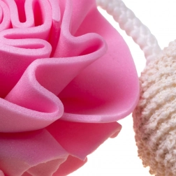 Růžová koupelová houba vytváří bohatou pěnu, jemně čistí a pomáhá vyhlazovat pokožku bez podráždění – ideální pro každodenní sprchu.
