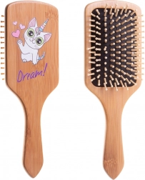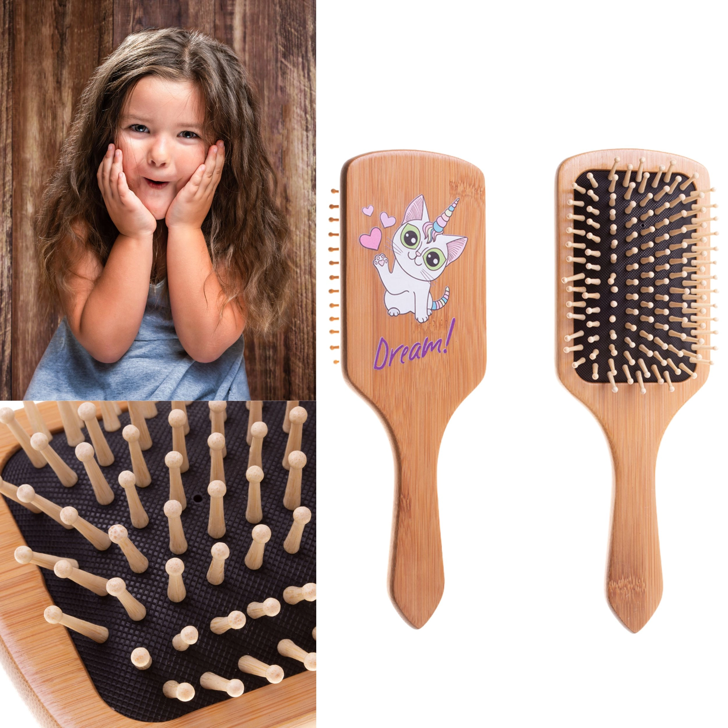 Díky přírodním materiálům je kartáč odolný, lehký a vhodný pro rovné i vlnité dětské vlasy. Zaoblené špičky kolíčků chrání citlivou pokožku a pomáhají rovnoměrně rozvádět přirozený maz po délce vlasu pro přirozený lesk. Design s roztomilým kočko-jednorožcem a nápisem „Dream!“ motivuje děti k samostatnému česání.