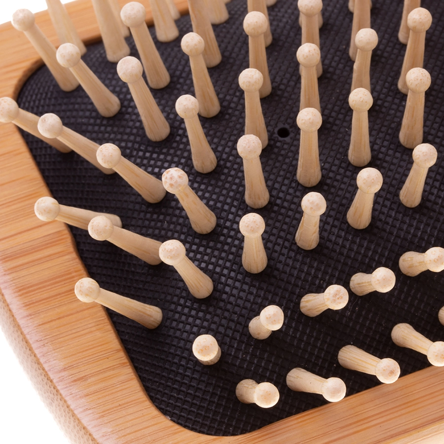 Zaoblené dřevěné kolíčky na pružné podložce hladce kloužou vlasy a masírují pokožku hlavy bez podráždění – ideální pro citlivé dětské vlásky.