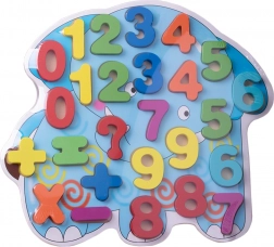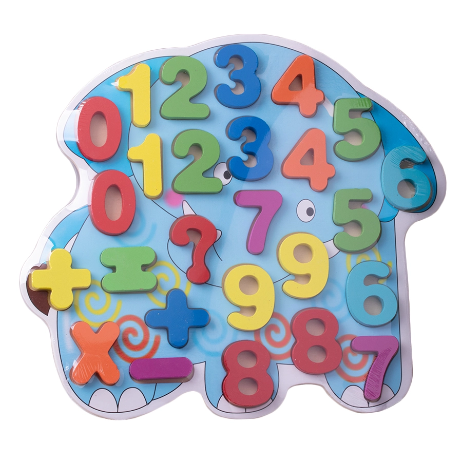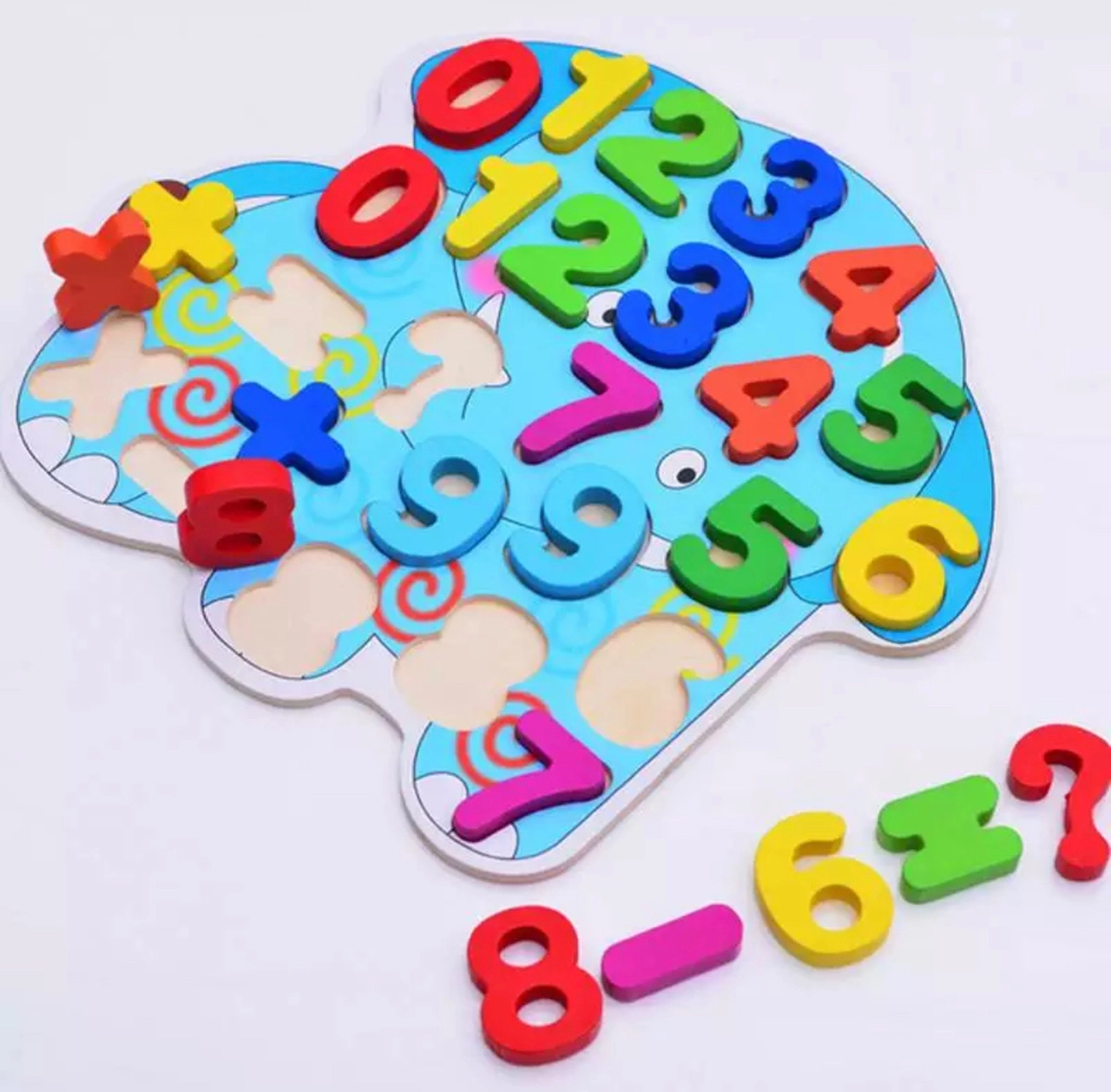 Toto dřevěné číselné puzzle ve tvaru slona je skvělým pomocníkem při prvním seznamování s čísly a jednoduchými příklady. Barevné, dobře padnoucí dílky s čísly 0–9 a symboly +, −, × se vkládají do vyfrézovaných otvorů, což posiluje soustředění a přesnost.