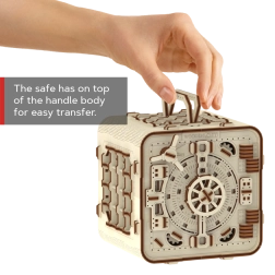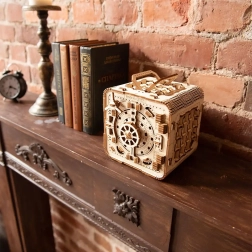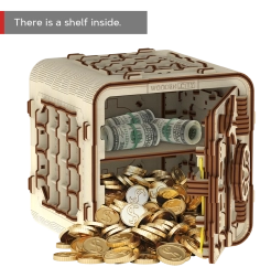 3D puzzle trezor od Wooden City je ideálním dárkem pro milovníky hádanek a krásných designů. Tento funkční model napodobuje mechanismus bankovního trezoru s tříčíselnou kombinací, kterou lze kdykoli změnit. Trezor obsahuje také tajnou funkci, která vám pomůže v případě zapomenutého kódu. Vzhled umocňuje rukojeť pro snadné přenášení a policový prostor uvnitř.