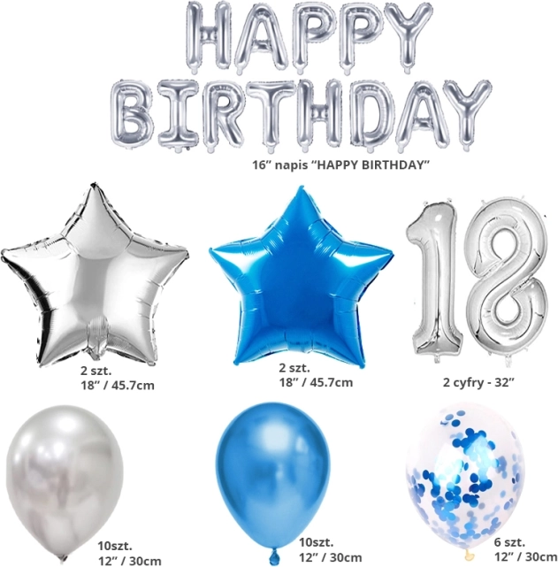 Oslavte 18. narozeniny se sadou balónků, které přidají jedinečnou atmosféru a učiní vaši oslavu nezapomenutelnou. S balonky ve stříbrno-modré kombinaci vytvoříte krásné prostředí pro vzpomínkové fotografie.
