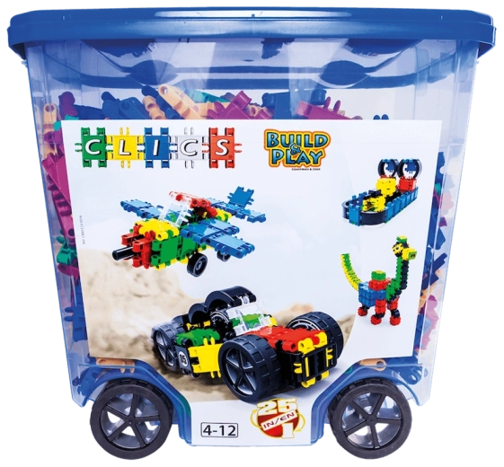 Obrovská stavebnice CLICS s více než 700 dílky nabízí až 25 modelů v jednom. Díky snadnému zacvakávacímu spojování děti rychle postaví zvířátka, vozidla i stavby a rozvíjejí kreativitu, jemnou motoriku a prostorovou představivost. Dílky z odolného polypropylenu jsou uloženy v praktickém boxu na kolečkách a splňují evropské bezpečnostní normy.