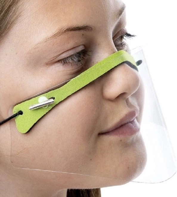 Tento mini obličejový štít s průhledným vizírem a zeleným nosním páskem je navržen tak, aby omezil přenos kapének a současně ponechal obličej viditelný. Je mimořádně lehký, komfortní a drží pomocí elastických pásků za ušima, takže neomezuje nošení brýlí a dovoluje svobodně dýchat.