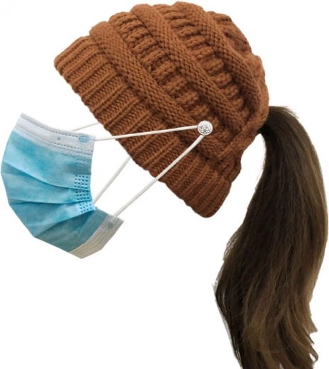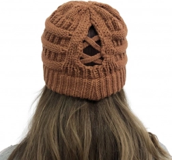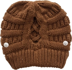 Stylová hnědá zimní čepice s chytrým otvorem na culík je ideální pro každodenní nošení. Udržuje hlavu v teple, zároveň umožňuje vlasy vyvést ven, takže zůstávají nezmačkané a upravené. Pružný pletený materiál se pohodlně přizpůsobí různým tvarům hlavy.