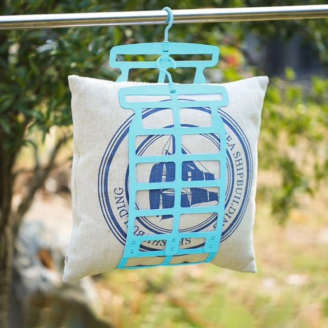 Praktický a odolný pomocník pro domácnost: multifunkční věšák na sušení polštářů, plyšáků, prádla a doplňků. Díky skladné konstrukci a univerzálnímu zavěšení na tyč, zábradlí či balkon usnadňuje sušení a větrání textilií. Vyroben z kvalitního plastu, je lehký, skládací a vhodný pro vnitřní i venkovní použití.