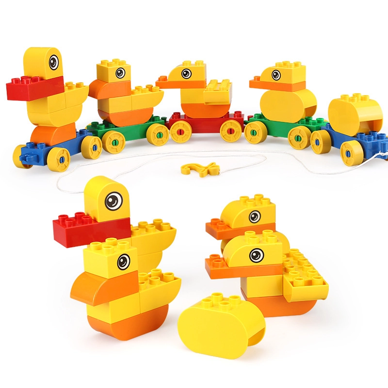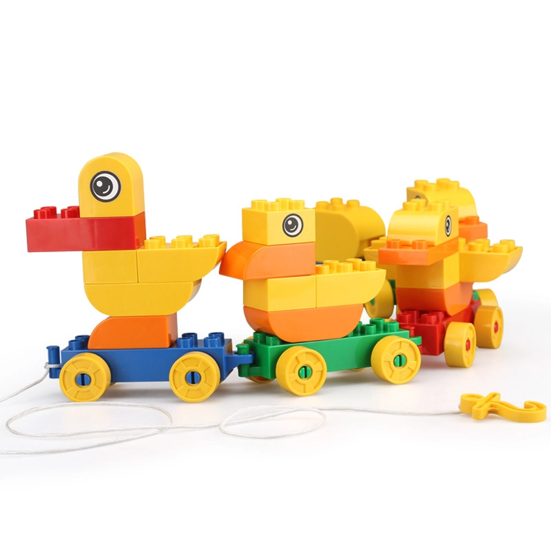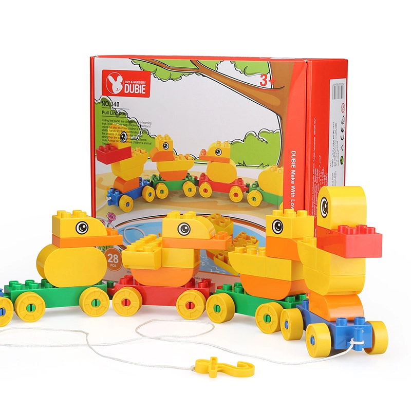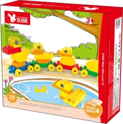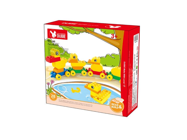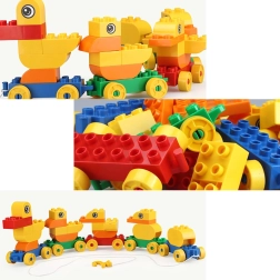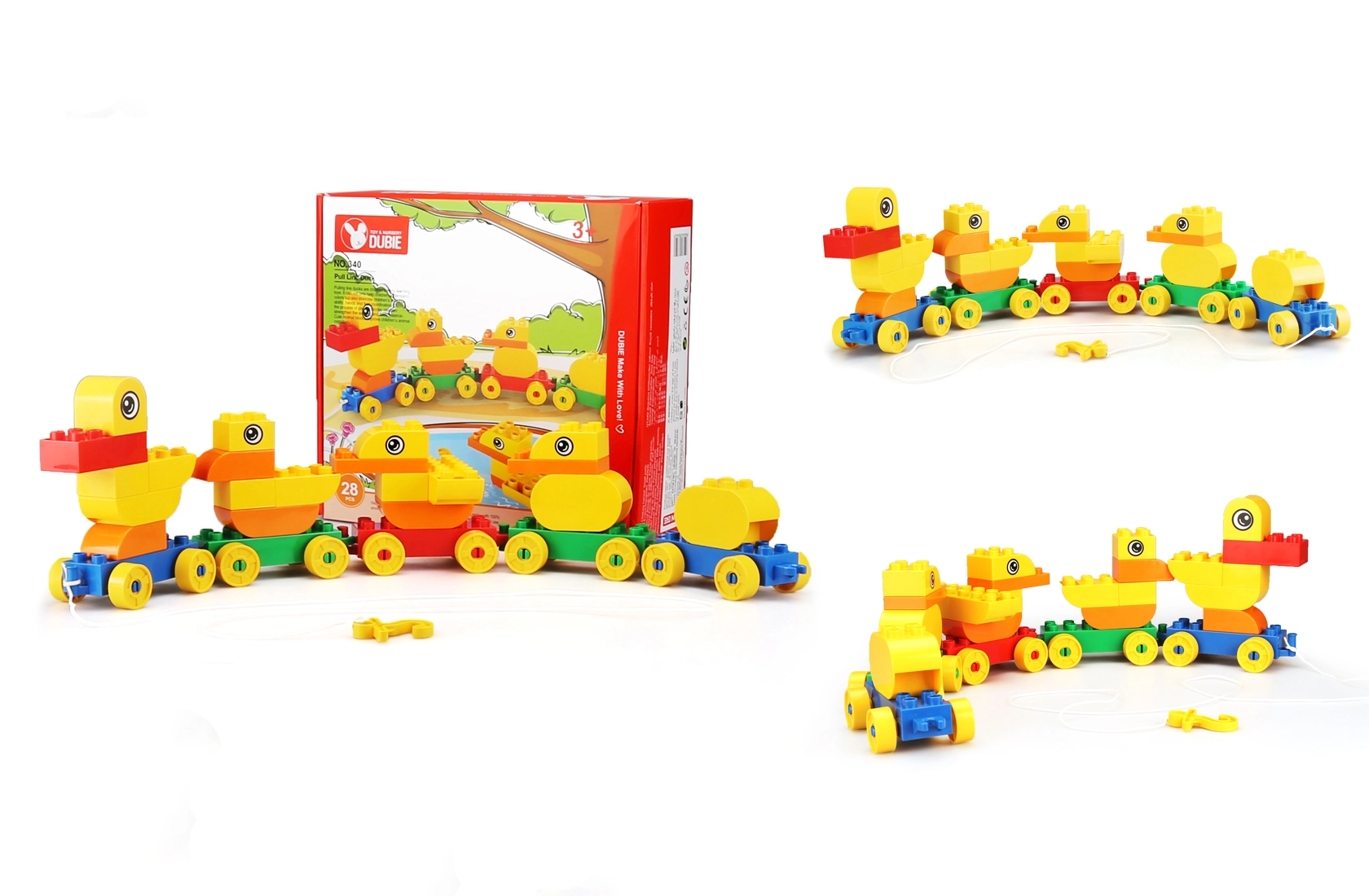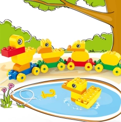 Z kostek sestavíte kachní rodinku a pomocí základů s kolečky je snadno spojíte do pojízdného vláčku.