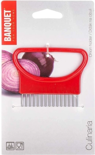 Praktický pomocník pro rychlé, přesné a bezpečné krájení cibule. Držák BANQUET Culinaria v červené barvě má rozměry 10,7 × 7,8 cm a kombinuje nerezovou ocel s odolným plastem. Je vhodný do myčky, usnadňuje rovnoměrné plátkování a chrání prsty při práci.
