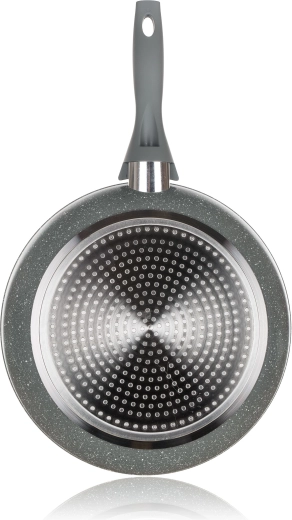 Tato litá kovaná hliníková pánev se šedým granitovým dekorem kombinuje špičkovou nepřilnavost s vysokou odolností. Díky kvalitnímu jádru skvěle vede teplo, urychluje přípravu jídel a pomáhá šetřit energii. Povrch je tvrdý, odolný vůči poškrábání a snadno se čistí.