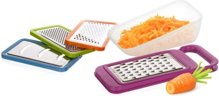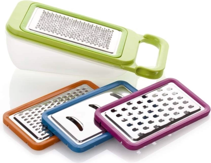 Jemné, hrubé i plátkovací strouhání v jedné sadě – od sýra a čokolády po brambory, mrkev a řepu. Šetří čas i místo v kuchyni.