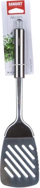 Lopatka do obracení s otvory Banquet Akcent je ideálním nástrojem pro pohodlnou manipulaci s jídlem při vaření. Je vyrobena z kvalitní nerezové oceli, což zajišťuje dlouhou životnost a odolnost proti korozi. Díky praktickému očku ji můžete snadno zavěsit.