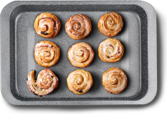 Povrch na bázi PTFE minimalizuje připalování a umožňuje péct s menším množstvím tuku. Po dopečení stačí plech jednoduše otřít.