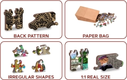 Nenechte si ujít příležitost objevit krásu unikátně tvarovaných dílků našeho WOODEN CITY puzzle. Každý dílek je vytvarován laserem a některé v podobě zvířat, budov či předmětů, což zvyšuje estetickou hodnotu výsledku. Puzzle jsou oboustranná, takže je můžete skládat jak okruh fotografie, tak dle vzoru na druhé straně.