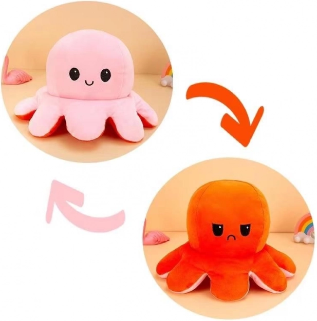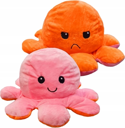 Tato oboustranná plyšová chobotnička je dokonalým společníkem pro děti i dospělé. Jednoduchým otočením během chvilky přepnete výraz z usměvavého na smutný či naštvaný a zároveň změníte barvu z růžové na oranžovou. Měkoučký materiál láká k mazlení a skvěle se hodí i jako antistresová hračka.