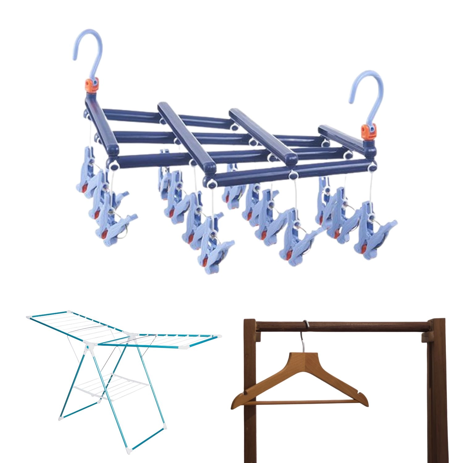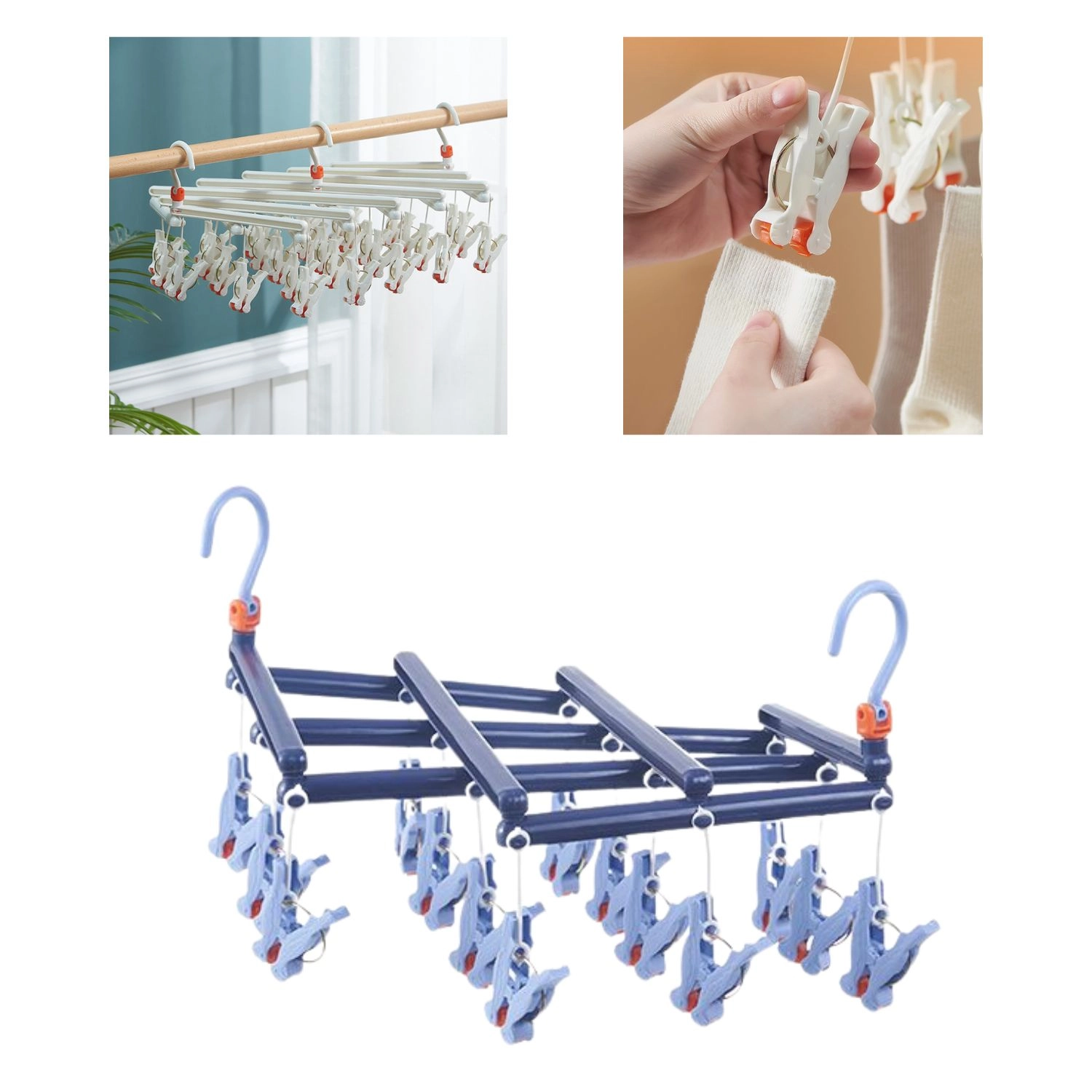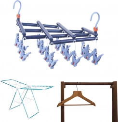 Objevte spolehlivé řešení pro každodenní sušení drobného prádla. Skládací sušák s 14 pevnými klipsy je vyroben z kvalitního plastu odolného vůči vlhkosti, takže jej můžete bez obav používat uvnitř i venku. Otočný háček se zámkem zajistí stabilní zavěšení kdekoli – na balkonové zábradlí, sušák, skříňovou tyč i kempingovou šňůru.