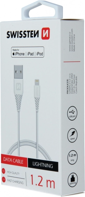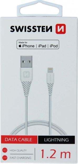 Spolehlivý USB–Lightning kabel od značky SWISSTEN s délkou 1,2 m a certifikací MFi pro bezproblémové nabíjení a synchronizaci zařízení Apple. Odolné provedení z TPE materiálu, stabilní přenos dat a bezpečné nabíjení v kompaktním balení Swissten retail.