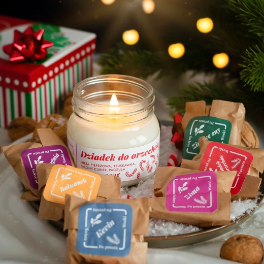 Dopřejte si vánoční atmosféru s prémiovou vonnou svíčkou „Louskáček“ z přírodního sojového vosku. Ručně vyrobená v malé manufaktuře s kvalitními parfemacemi, nabízí klasickou vůni vánočních sladkostí s tóny máty, jahod, karamelizovaného cukru a pačuli. Minimalistický design, šetrné k přírodě, obsah 200 g.