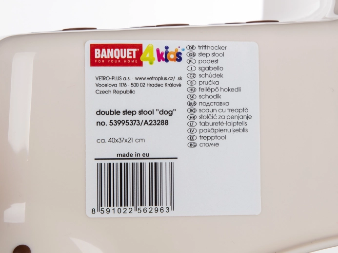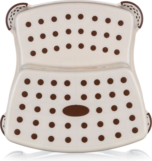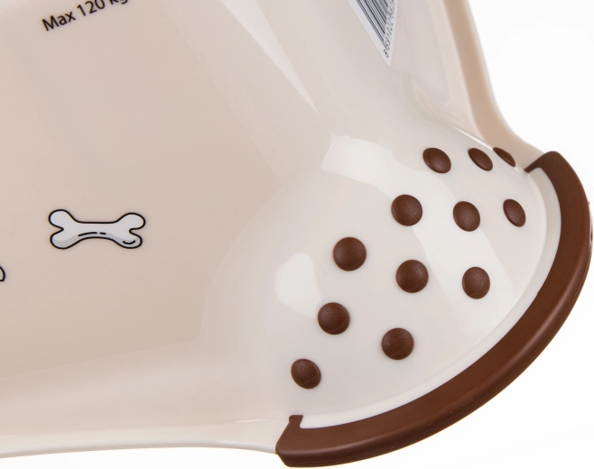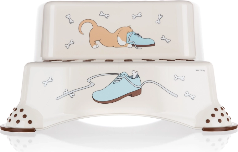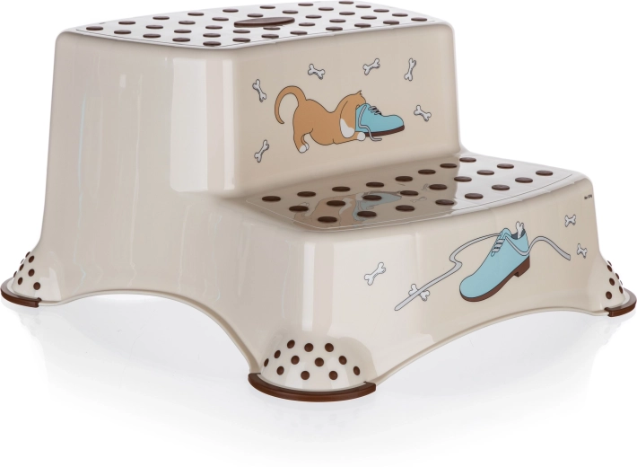 Béžový dvoustupňový schůdek se zábavným motivem DOG je ideální pomůckou pro děti do koupelny, kuchyně či dětského pokoje. Protiskluzové výstupky na stupních a protiskluzové patky na spodní části zajišťují jistý krok na mokrém i suchém povrchu. Díky kompaktním rozměrům 40,5 × 37 × 21 cm se snadno přenáší a skladuje.