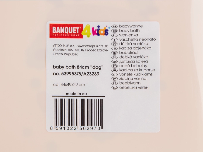 Vanička BANQUET s dekorrem Dog je navržena pro pohodlné a bezpečné koupání kojenců a batolat. Ergonomické tvarování podepírá tělo dítěte, zatímco hladké zaoblené hrany zvyšují bezpečí i komfort. Díky lehké plastové konstrukci se vanička snadno přenáší a udržuje v čistotě.
