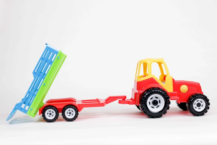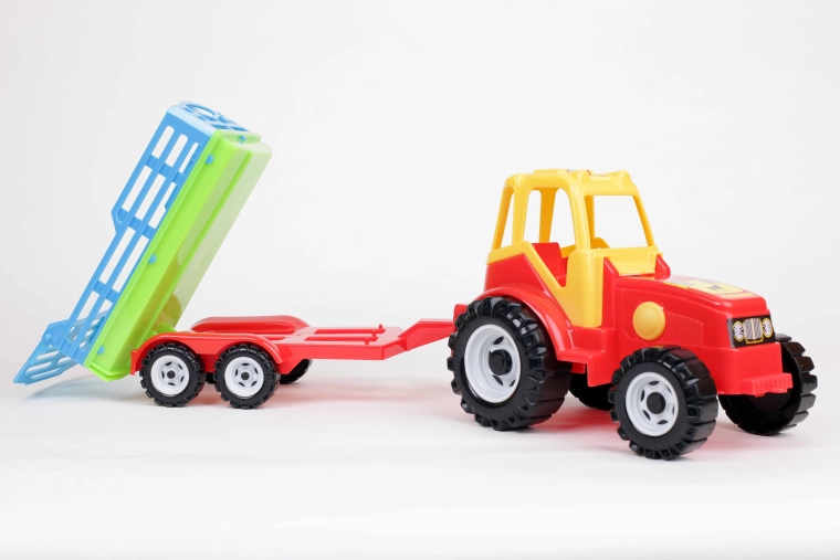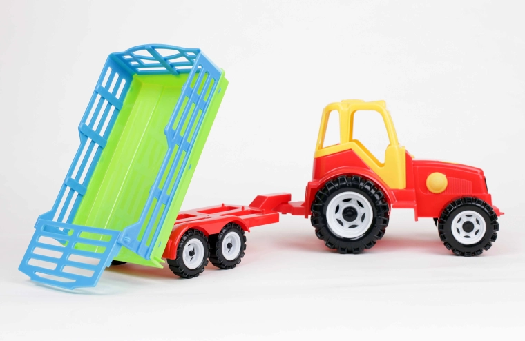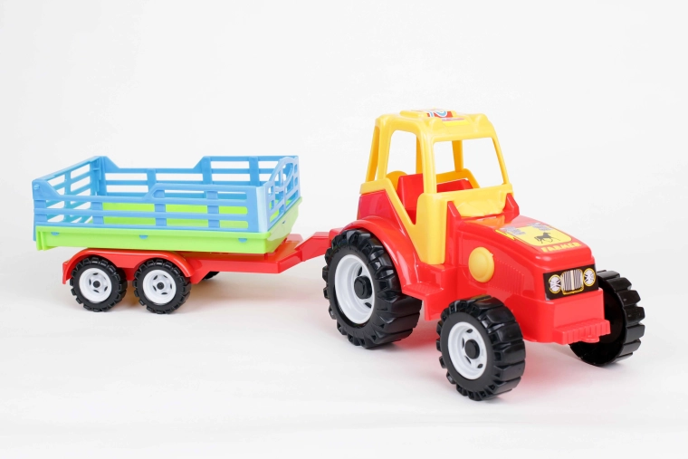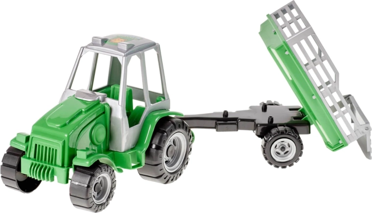 Objevte robustní plastový traktor s přívěsem, který potěší malé farmáře. Dvounápravová vlečka se sklápěním dozadu snadno odveze seno, kostky či figurky zvířátek. Díky velkým kolům je hra plynulá na různých površích, uvnitř i venku.