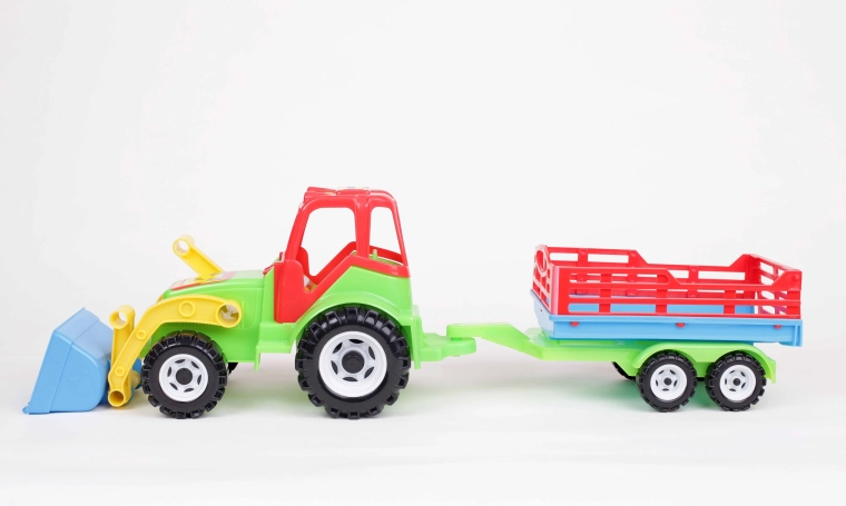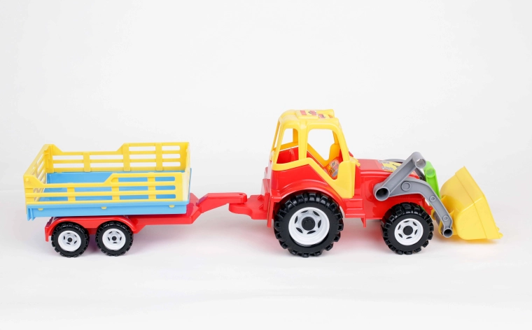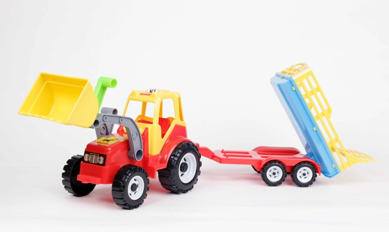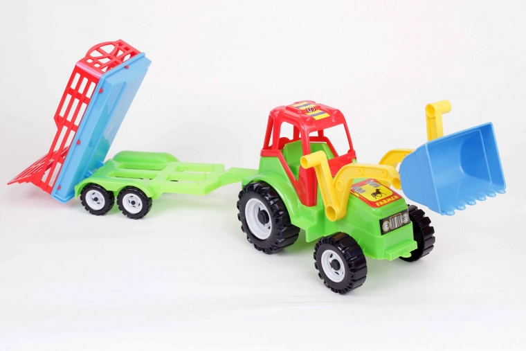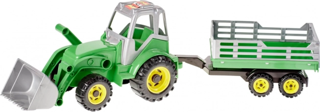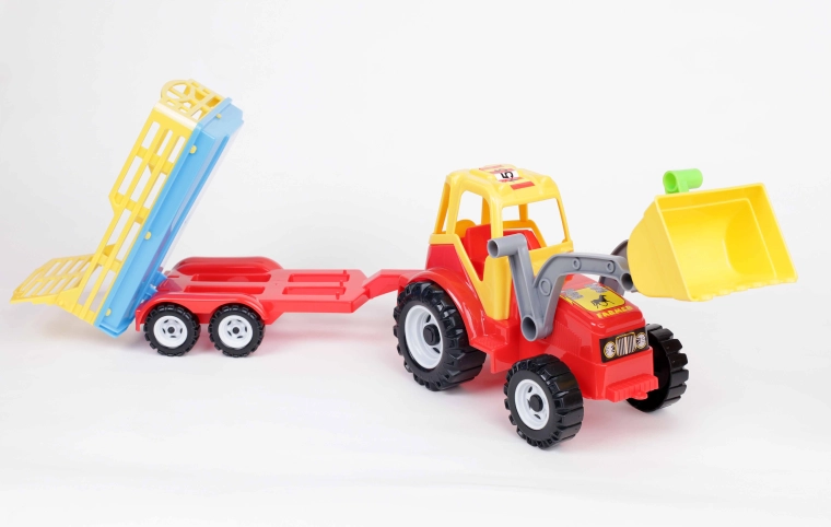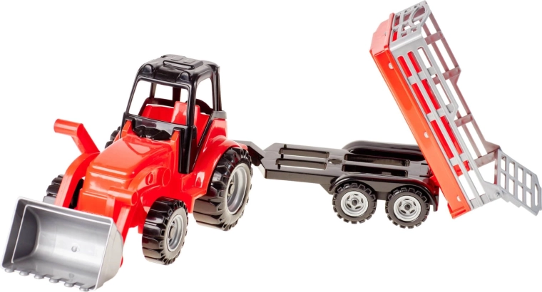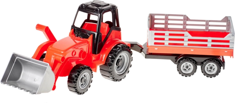 Tento robustní traktor s přívěsem je skvělou volbou pro děti, které milují staveniště a farmářské práce. Čelní nakladač snadno nabírá a překládá materiál, zatímco přívěs na zadním závěsu lze vyklápět dozadu pro pohodlné vysypání nákladu. Styl přívěsu připomíná senážní/hay přívěs s výklopnými dvířky, což zaručuje ještě realističtější hru.