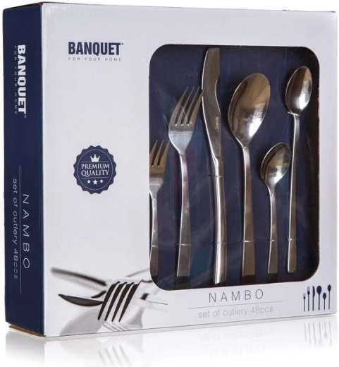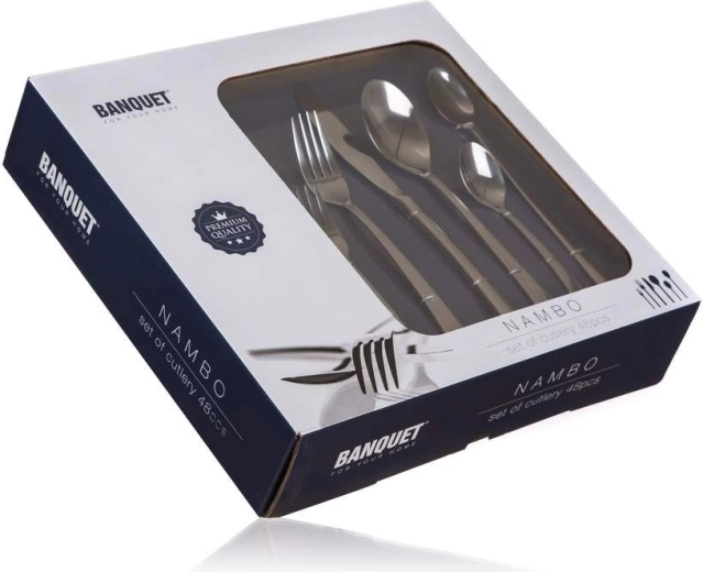 Sada příborů BANQUET NAMBO v počtu 48 kusů je ideální volbou pro rodinné stolování i hostiny. Vyvážený tvar a lesklé provedení z nerezové oceli 18/0 dodají vašemu stolu moderní a čistý vzhled.
