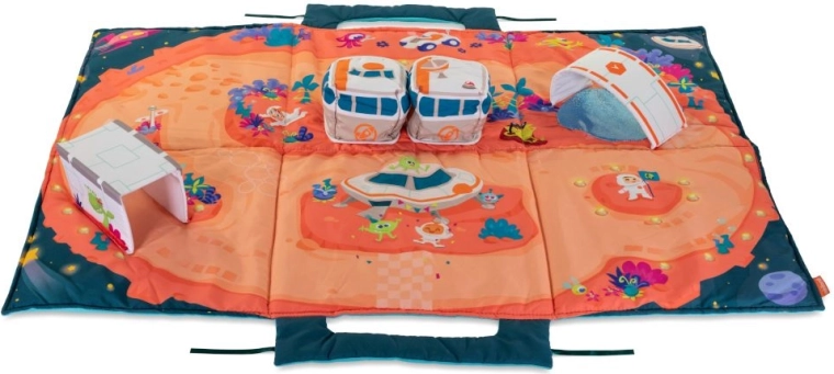 Vydejte se na vesmírnou expedici s měkkou senzorickou podložkou, která rozvíjí smysly a představivost dětí. Nabízí 3D prvky (most, tunel, garáže), šustivé detaily, kapsy na autíčka a snadné přenášení díky úchytům. Součástí jsou 2 odolná ergonomická autíčka pro hodiny kreativní hry.