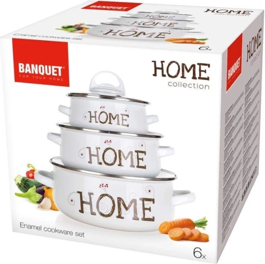 Sada BANQUET Home přináší spolehlivé hrnce pro každou kuchyni – lehké, odolné a snadno udržovatelné. Nadčasový bílý design s nápisem HOME se hodí do moderních i tradičních interiérů, skleněné poklice s plastovým knobem umožňují kontrolu pokrmů bez zbytečného zvedání víka.