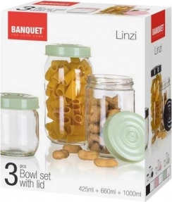 Praktická sada tří skleněných dóz LINZI o objemech 425 ml, 660 ml a 1000 ml pro přehledné uchování potravin. Skleněná těla s plastovými víčky v růžové barvě zajišťují pevné uzavření a delší čerstvost obsahu – ideální na těstoviny, cukr, ořechy či koření. Kvalita a styl od značky BANQUET do každé kuchyně.