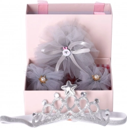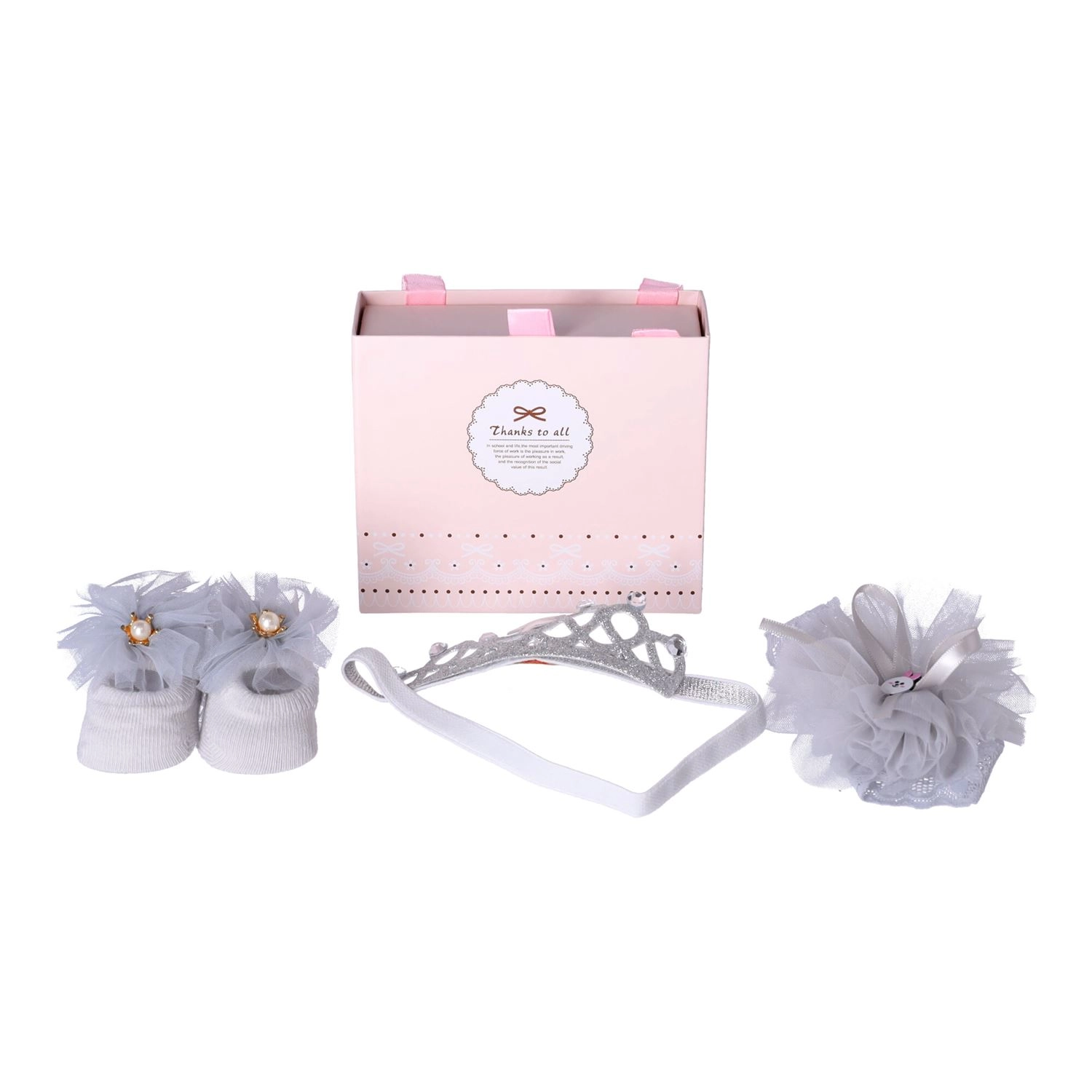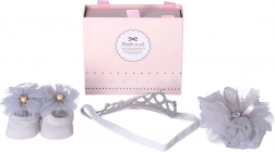 Okouzlující dárková sada 3 v 1 pro novorozence zahrnuje dva pohodlné čelenky a sladěné botičky/socks, vše v jemné světle šedé barvě. Ideální na křtiny, uvítání miminka nebo baby shower. Díky měkkému a pružnému materiálu čelenek miminku netlačí hlavičku a stylové zdobení dodá každému outfitu výjimečný nádech. Sada je dodána v dekorativní dárkové krabičce, připravené k okamžitému předání.