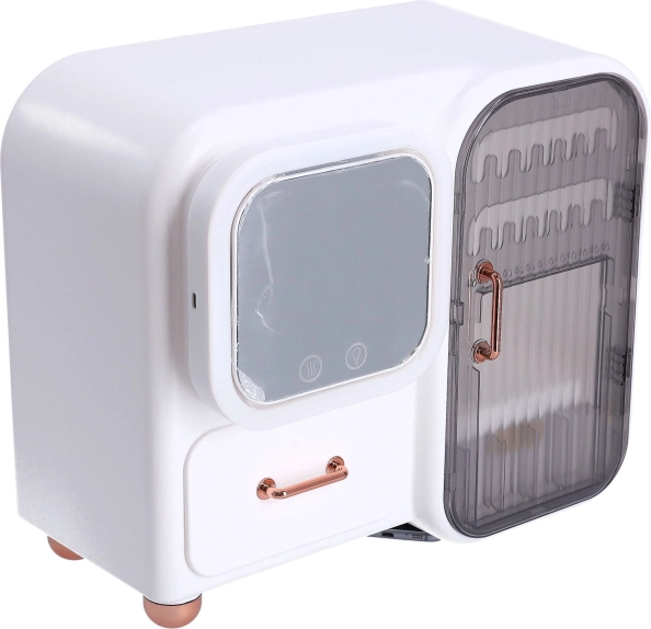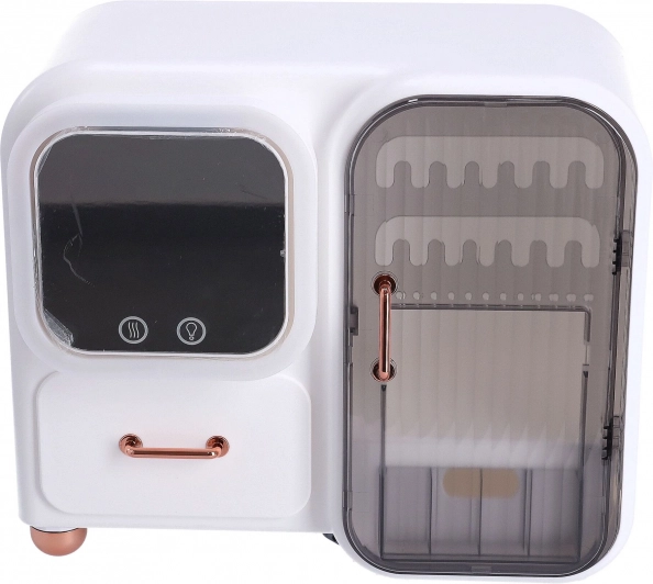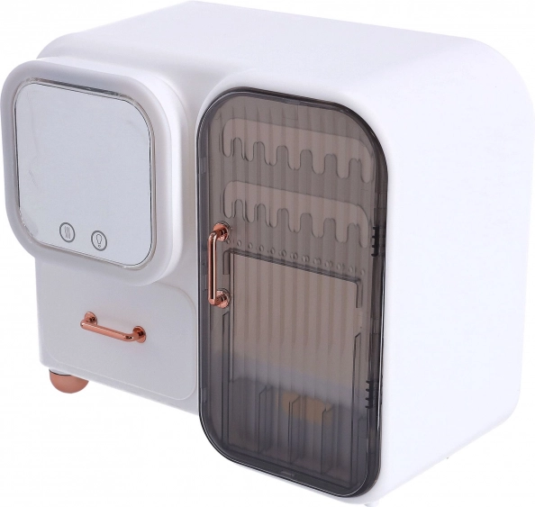 Zabudované zrcadlo je vybaveno LED osvětlením s třemi různými světelnými efekty: teplé, přirozené a studené světlo. Zrcadlo je otočné a skrývá úložný prostor na další kosmetické potřeby. Díky zabudovanému ventilátoru bude váš make-up rychleji suchý.