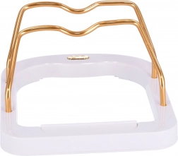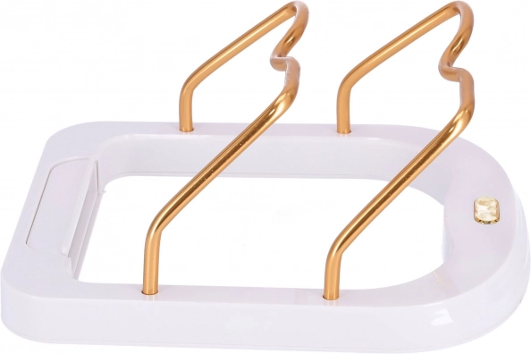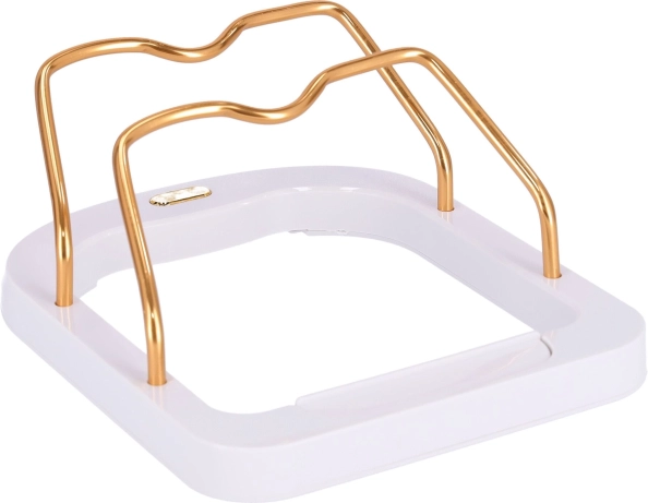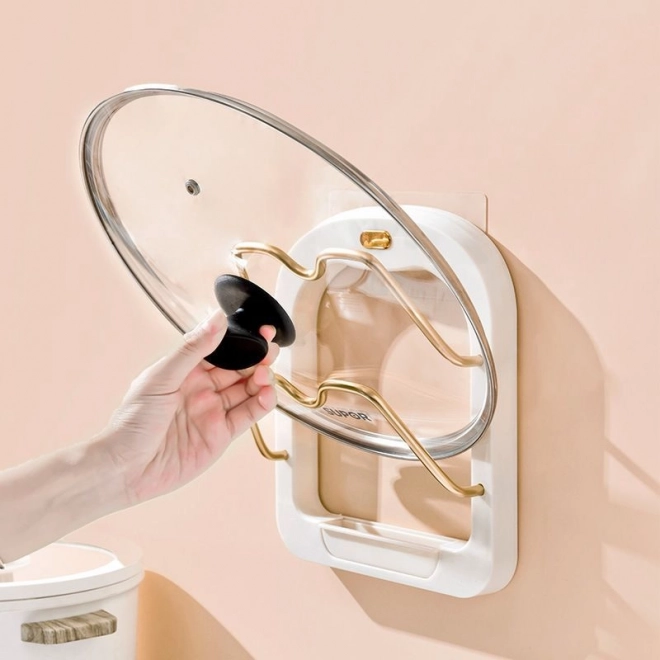 Minimalistický držák na poklice kombinuje bílý plast a zlaté kovové prvky, které kuchyni dodají moderní akcent. Díky nástěnné montáži máte poklice vždy po ruce, pracovní deska zůstává volná a vaření je plynulejší.