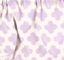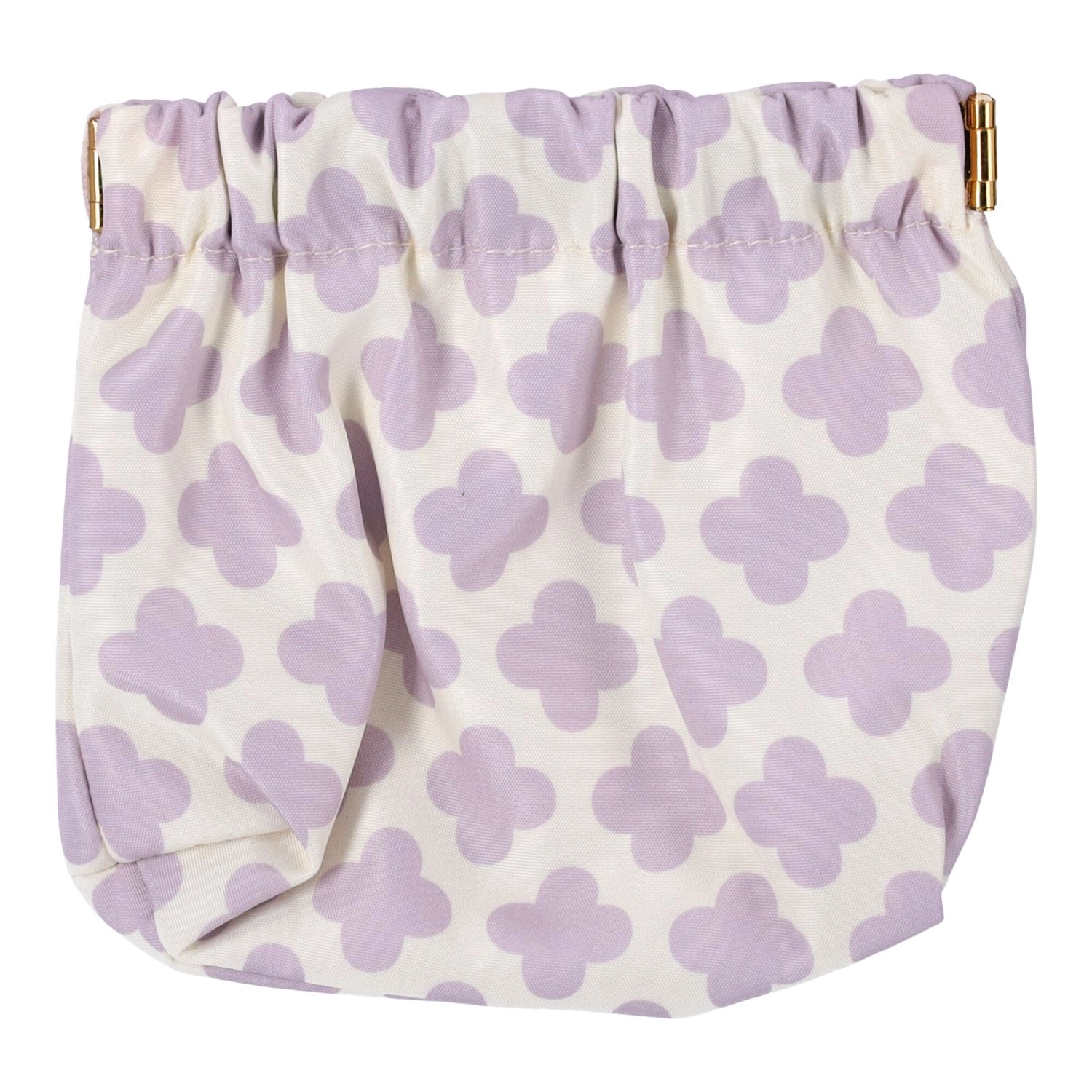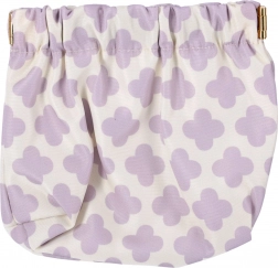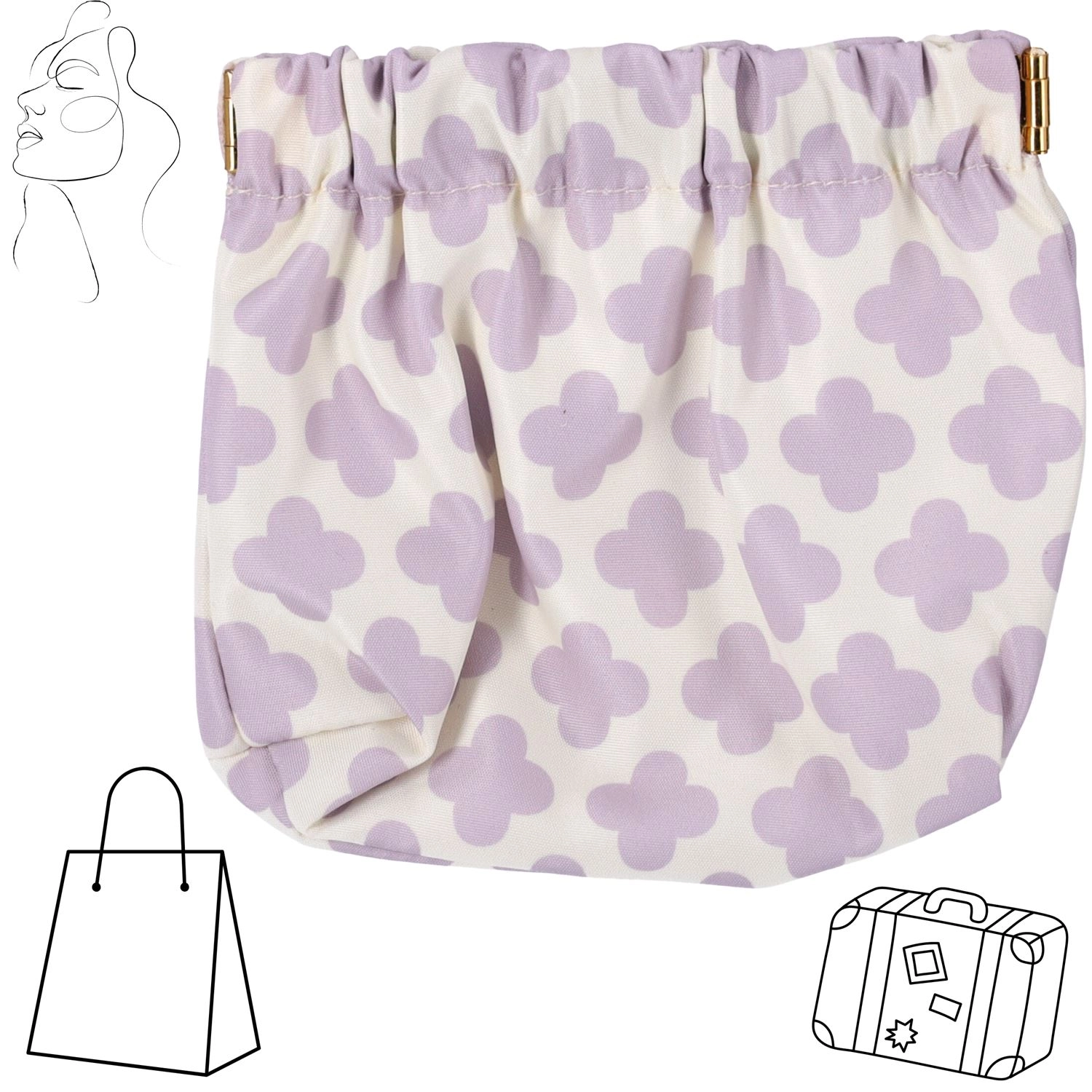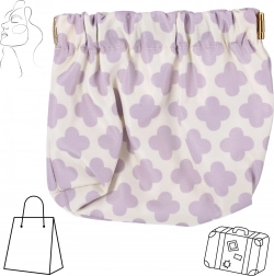 Taštička je vyrobena z kvalitní textilie s jemným, ženským vzorem v odstínu levandule na bílém podkladu. Elastické stažení umožňuje rychlé otevření a spolehlivé uzavření, takže se obsah nevysype. Je lehká, měkká a výborně drží tvar.