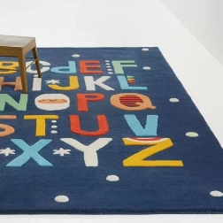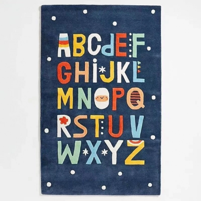Stylový dětský koberec s motivem Alphabet na tmavě modrém podkladu poskytne dětem měkké, bezpečné a nehlučné místo na hraní i první krůčky. Díky protiskluzové spodní straně zůstává pevně na místě, je snadno pratelný a svými rozměry 140 × 80 cm se skvěle hodí do dětského pokoje, herny i obýváku.