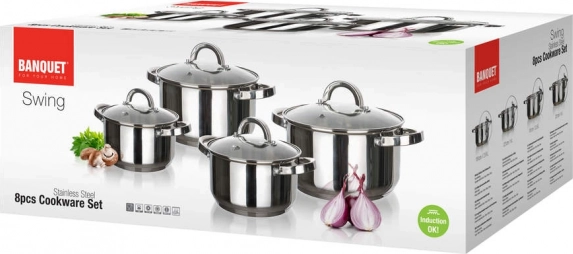 Sada nádobí Swing obsahuje čtyři univerzální hrnce s poklicemi: 16 × 10 cm, 18 × 11 cm, 20 × 12 cm a 24 × 14 cm. Každý kus je vyroben z kvalitní nerezové oceli s lesklou úpravou uvnitř i zvenku a poklicí z temperovaného skla s parním otvorem pro dokonalý přehled nad vařením.