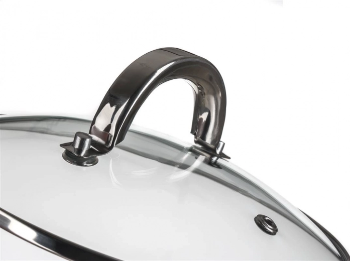 - Poklice z temperovaného skla: parní ventil pro kontrolu varu bez zvedání.