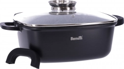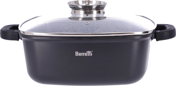 Hranatý hrnec Granite od značky BERRETTI vyniká odolným litým hliníkem a kvalitní nepřilnavou granitovou vrstvou, která brání připékání a umožňuje vařit s menším množstvím tuku. Skleněná poklice s parním ventilem poskytuje přehled nad průběhem vaření bez zbytečného odklápění.