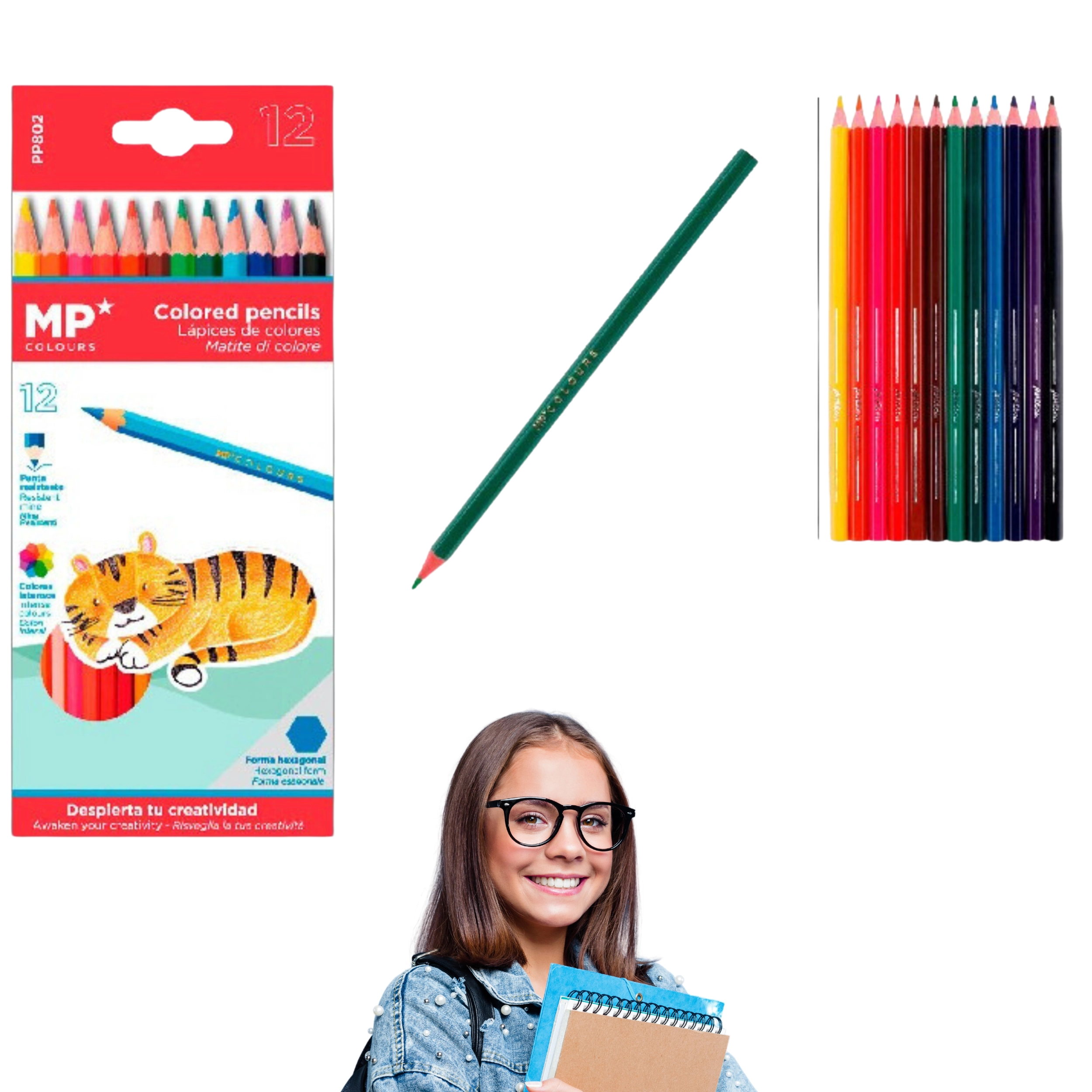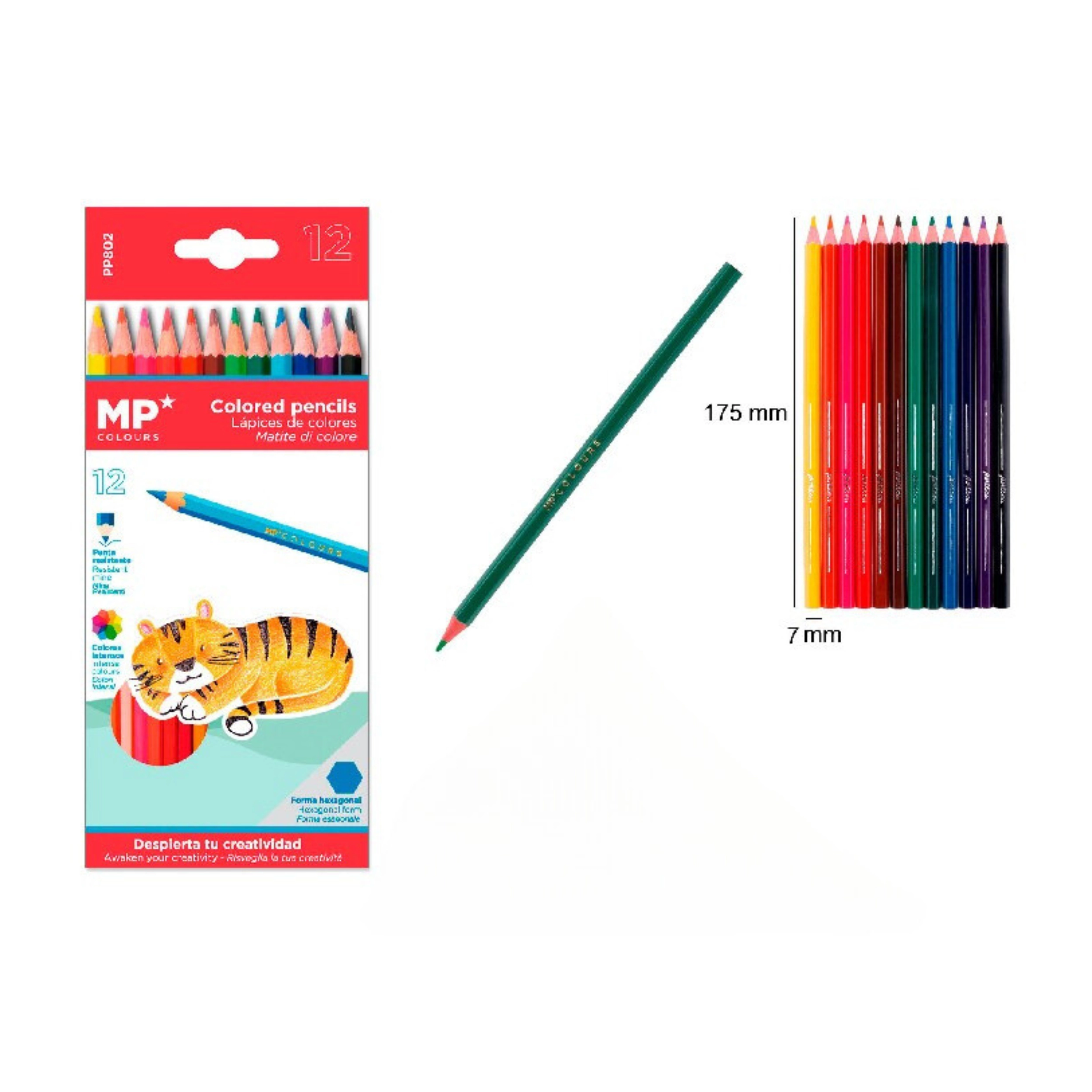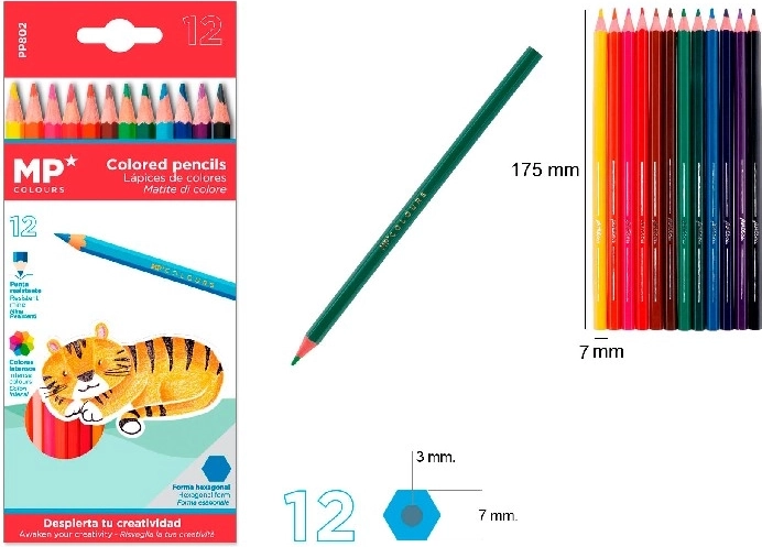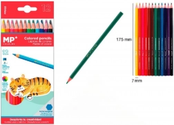 Sada 12 barevných pastelek MP je ideální pro vybarvování, skicování i detailní ilustrace. Každá pastelka má sytý pigment, který zaručí výrazné a rovnoměrné pokrytí bez nadměrného tlaku.