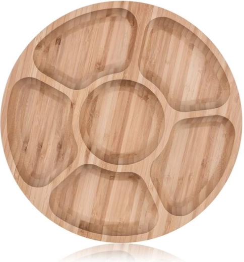 Stylová dělená miska z přírodního bambusu o průměru 31,5 cm je ideální pro servírování různých pochutin, oříšků, sýrů či dipů. Šest praktických přihrádek udrží vše přehledně oddělené, zatímco přírodní vzhled bambusu ozdobí každý stůl. Lehká, odolná a snadno udržovatelná – perfektní volba pro každodenní použití i hostiny.
