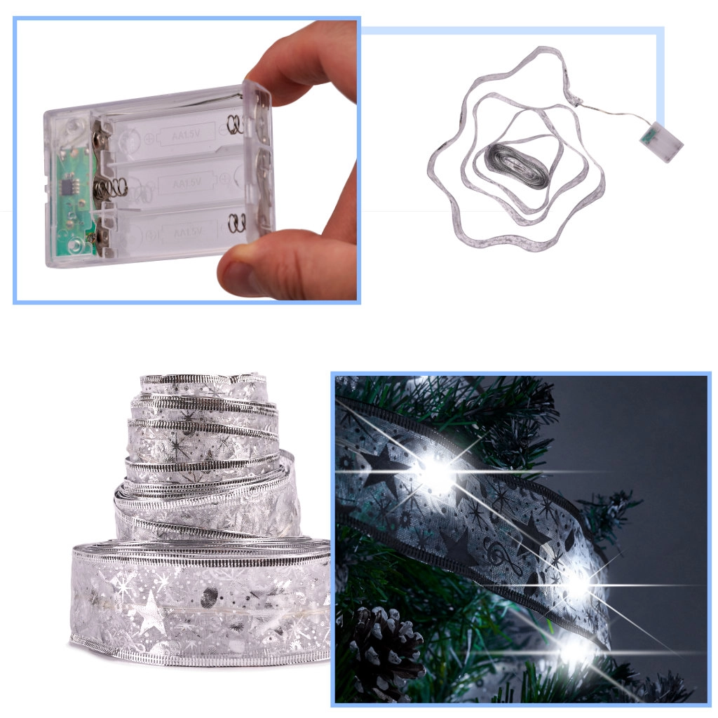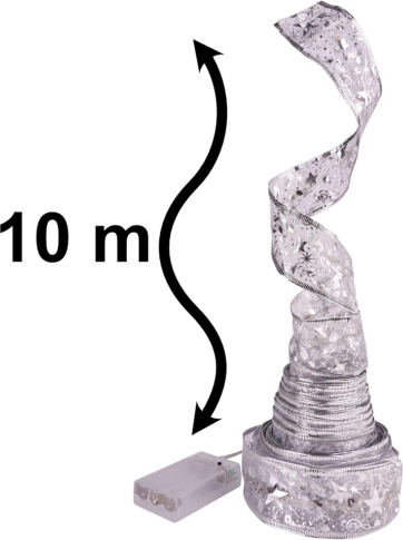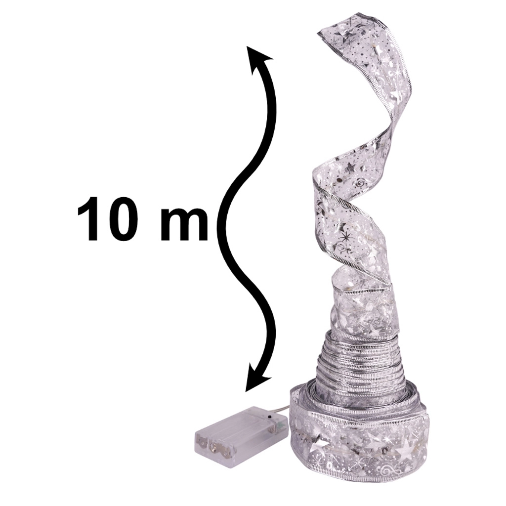 Stříbrná ozdobná LED stuha 10 m se 100 LED, studená bílá, 8 režimů, napájení 3× AA. Flexibilní a ideální pro vánoční dekorace doma i venku (IP44).