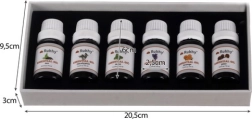 Sada obsahuje šest různých vůní jako eukalyptus, pomeranč, tea tree, máta, levandule a borovice. Každý olej je pečlivě uzavřený v lahvičce s objemem 10 ml.