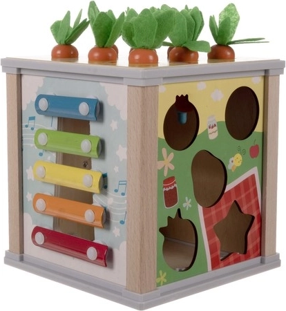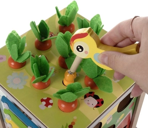 - Různorodé hry: Obsahuje cymbálky, třídič tvarů, ozubená kola, hodiny a vyndavací magnetické robáčky s mrkvičkami.