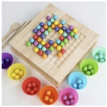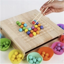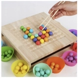 Práce s pinzetou, hůlkami a lžičkou při manipulaci s kuličkami podporuje správný úchop, přesnost pohybů a soustředění – ideální montessori styl učení hrou.