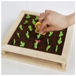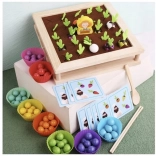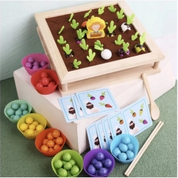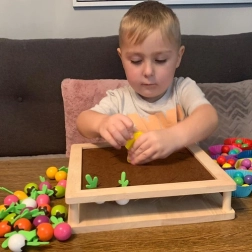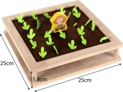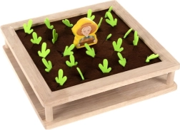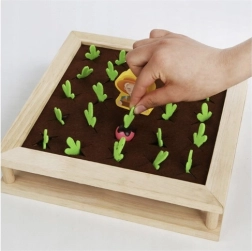 Tato dřevěná vzdělávací hra 2v1 propojuje volnou hru s učením. Děti mohou „sázet“ a sklízet filcové zeleninové dílky v zahrádce, třídit a počítat korálky podle barev do misek, nebo si zahrát memory s tematickými kartami. Robustní dřevěná deska je oboustranná – jedna strana je určená pro vkládání kuliček a trénink úchopu, druhá nabízí farmářskou hru na paměť a pozorování.