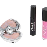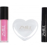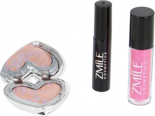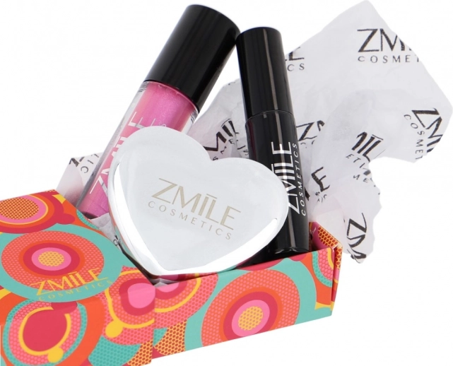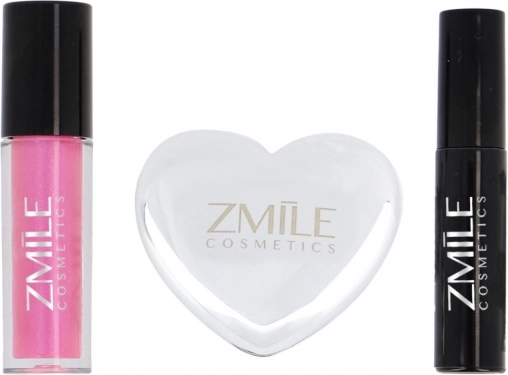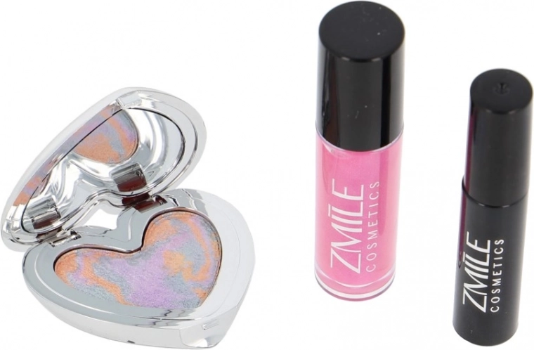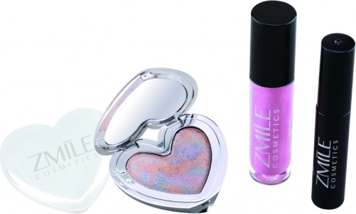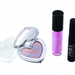 Trojice produktů – oční stíny v srdíčkové paletce, lesk na rty a řasenka – tvoří praktickou sadu pro každodenní i večerní make‑up.